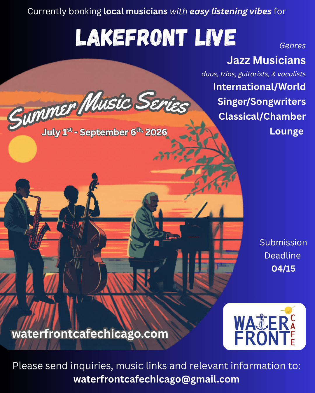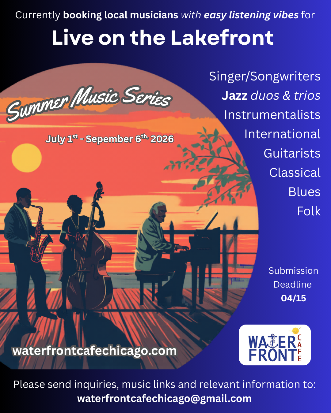 The Waterfront Café presents complimentary music by local musicians who create a relaxing and inviting environment for our dining guests while not being too distracting from engaging dinner conversations, as well as respecting the open-aired environment of Berger Park and our Edgewater neighbors.